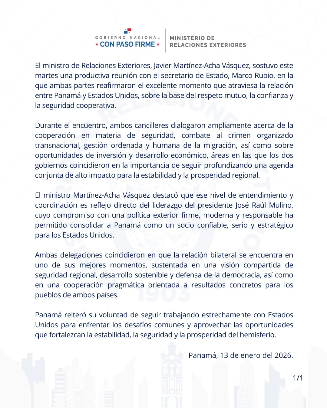 El ministro de Relaciones Exteriores, Javier Martínez-Acha Vásquez, sostuvo una productiva reunión con el secretario de Estado, Marco Rubio, en la que ambas partes reafirmaron el excelente momento que atraviesa la relación entre Panamá y Estados Unidos, sobre la base del respeto mutuo, la confianza y la seguridad cooperativa.