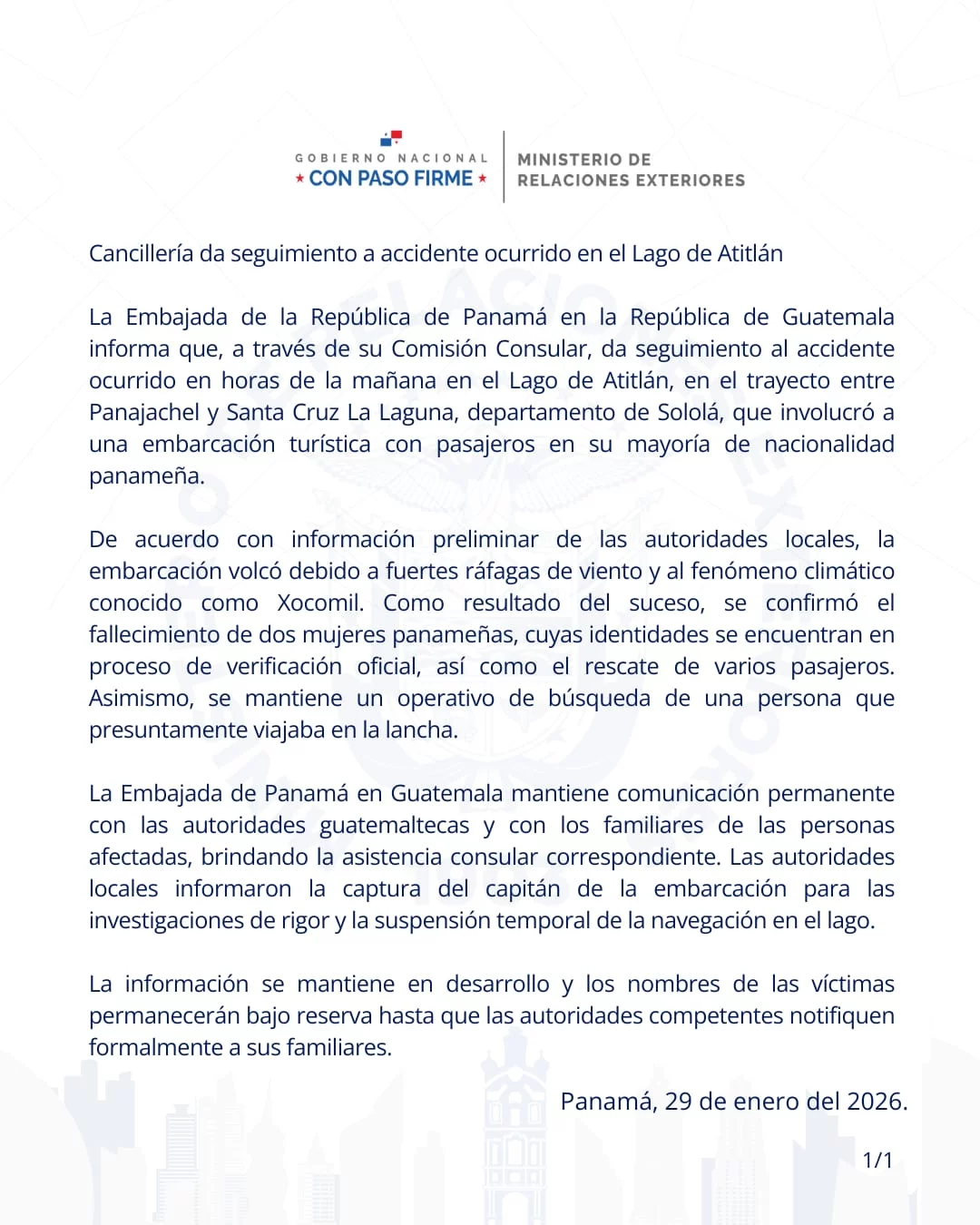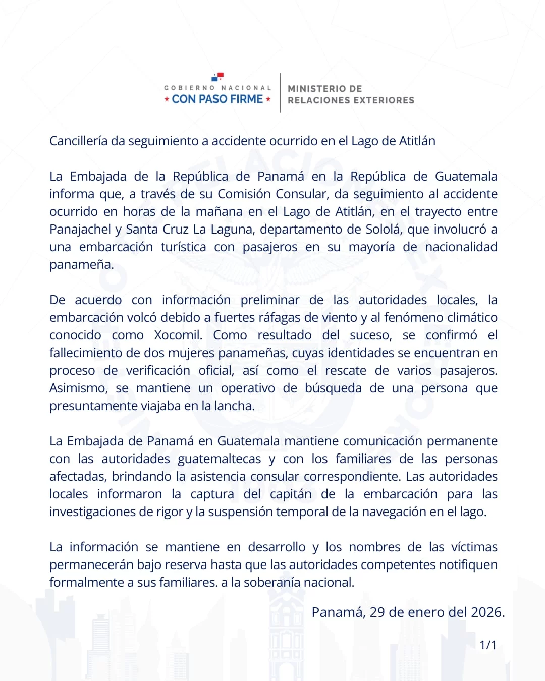 Cancillería da seguimiento a accidente ocurrido en el Lago de Atitlán jbagonzalez2026-01-29T10:23:25-05:0029 de enero de 2026| Comparte esta noticia en tus redes FacebookXWhatsAppCorreo electrónico Artículos relacionados Vicecanciller Hoyos fortalece agenda diplomática de Panamá en reuniones bilaterales de alto nivel Galería Vicecanciller Hoyos fortalece agenda diplomática de Panamá en reuniones bilaterales de alto nivel 29 de enero de 2026 Canciller Martínez-Acha Vásquez se reúne con ejecutivos de All Nippon-Airways Galería Canciller Martínez-Acha Vásquez se reúne con ejecutivos de All Nippon-Airways 29 de enero de 2026 Presidente Mulino y Paz acuerdan renovar las relaciones entre Panamá y Bolivia Galería Presidente Mulino y Paz acuerdan renovar las relaciones entre Panamá y Bolivia 28 de enero de 2026 Mandatarios Mulino y Arévalo sostienen reunión bilateral Galería Mandatarios Mulino y Arévalo sostienen reunión bilateral 28 de enero de 2026
