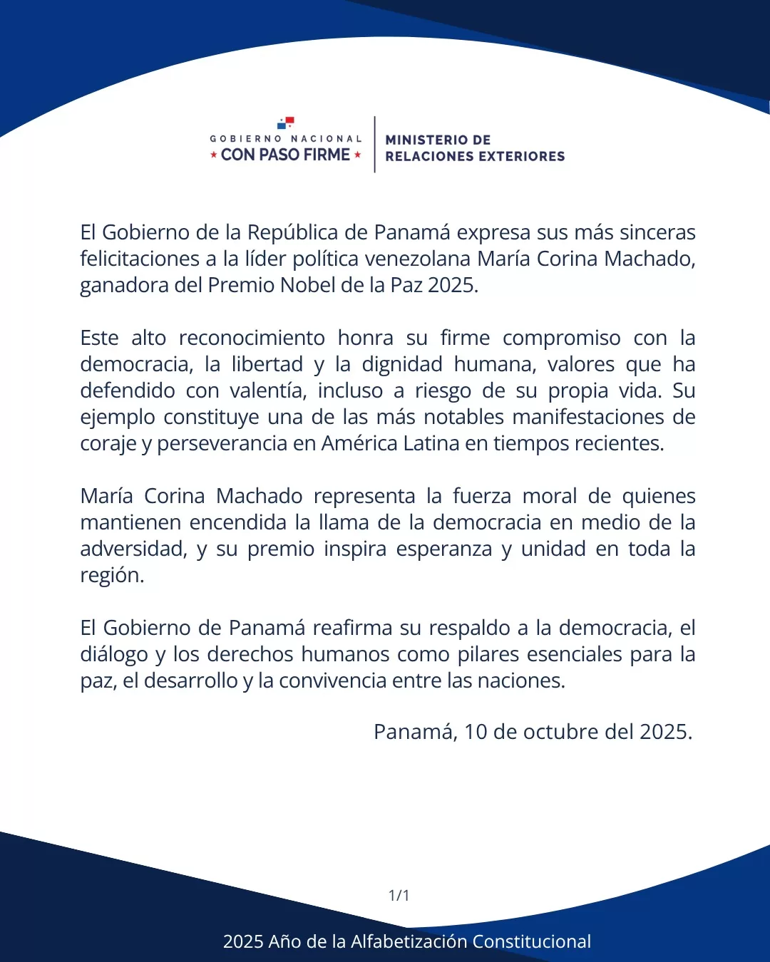 El Gobierno de la República de Panamá felicita a la Honorable Primera Ministra de Barbados, Mia Amor Mottley, por su contundente victoria en las elecciones generales y por el inicio de su tercer mandato consecutivo al frente del Gobierno de ese hermano Estado insular del Caribe.