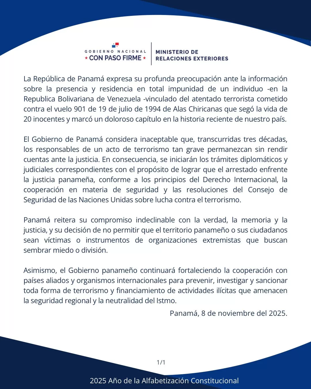 Comunicado Edgardo Dominguez2025-11-09T08:03:47-05:008 de noviembre de 2025| Comparte esta noticia en tus redes FacebookXWhatsAppCorreo electrónico Artículos relacionados Panamá promueve cooperación, turismo e inversiones en Dubái Galería Panamá promueve cooperación, turismo e inversiones en Dubái 5 de febrero de 2026 Construir puentes de entendimiento y cooperación, propone en Dubái canciller Martínez-Acha Vásquez Galería Construir puentes de entendimiento y cooperación, propone en Dubái canciller Martínez-Acha Vásquez 5 de febrero de 2026 Panamá impulsa la ciberdiplomacia para consolidarse como referente de servicios digitales Galería Panamá impulsa la ciberdiplomacia para consolidarse como referente de servicios digitales 4 de febrero de 2026 Canciller Martínez-Acha Vásquez participa en mesa ministerial y en encuentros bilaterales en Cumbre Mundial de Gobiernos en Dubái Galería Canciller Martínez-Acha Vásquez participa en mesa ministerial y en encuentros bilaterales en Cumbre Mundial de Gobiernos en Dubái 4 de febrero de 2026