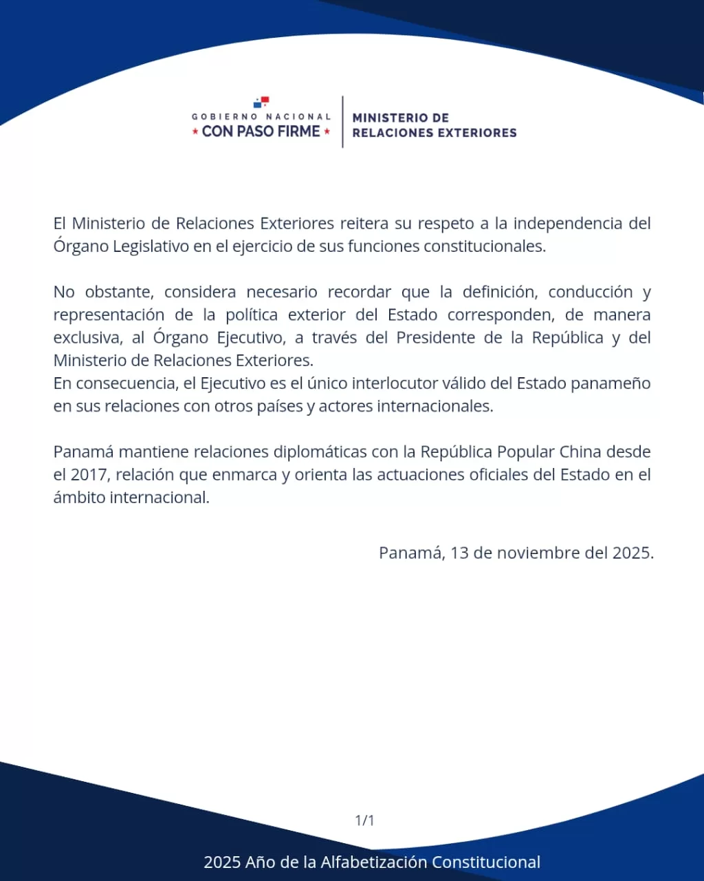Comunicado Edgardo Dominguez2025-11-14T10:32:48-05:0013 de noviembre de 2025| Comparte esta noticia en tus redes FacebookXWhatsAppCorreo electrónico Artículos relacionados Panamá se consolida como hub regional de telecomunicaciones Galería Panamá se consolida como hub regional de telecomunicaciones 23 de diciembre de 2025 Panamá reafirma su rol como actor clave en la diplomacia humanitaria Galería Panamá reafirma su rol como actor clave en la diplomacia humanitaria 22 de diciembre de 2025 Cancillería afirma que buques interceptados no respetaban las normas en materia marítima internacional Galería Cancillería afirma que buques interceptados no respetaban las normas en materia marítima internacional 22 de diciembre de 2025 Panamá avanza en la puesta en marcha del Centro Regional Copernicus-LAC Galería Panamá avanza en la puesta en marcha del Centro Regional Copernicus-LAC 22 de diciembre de 2025