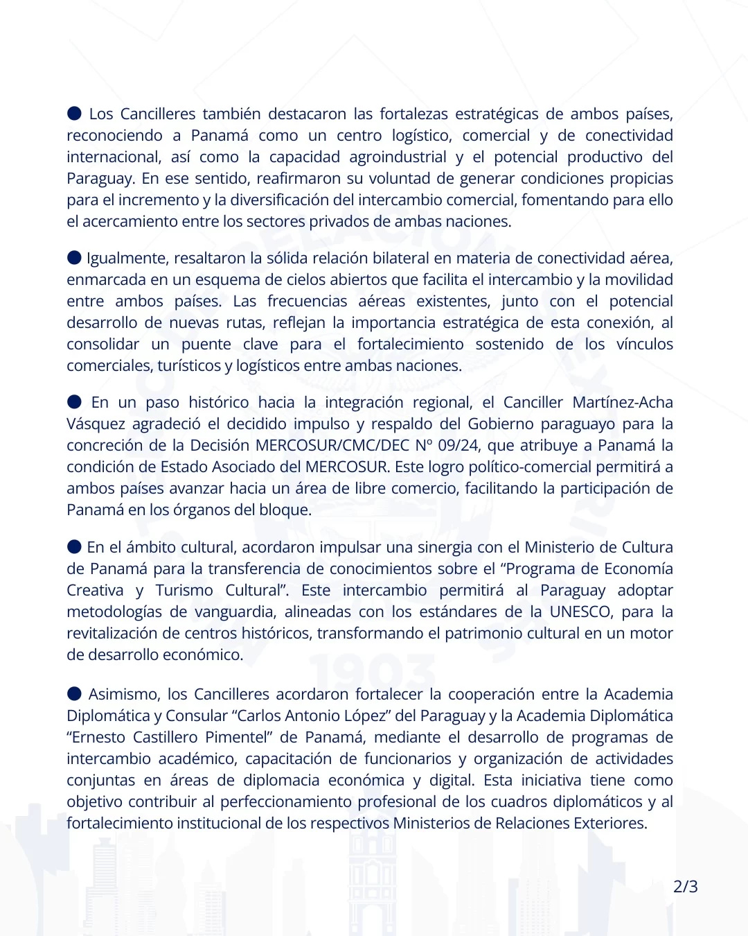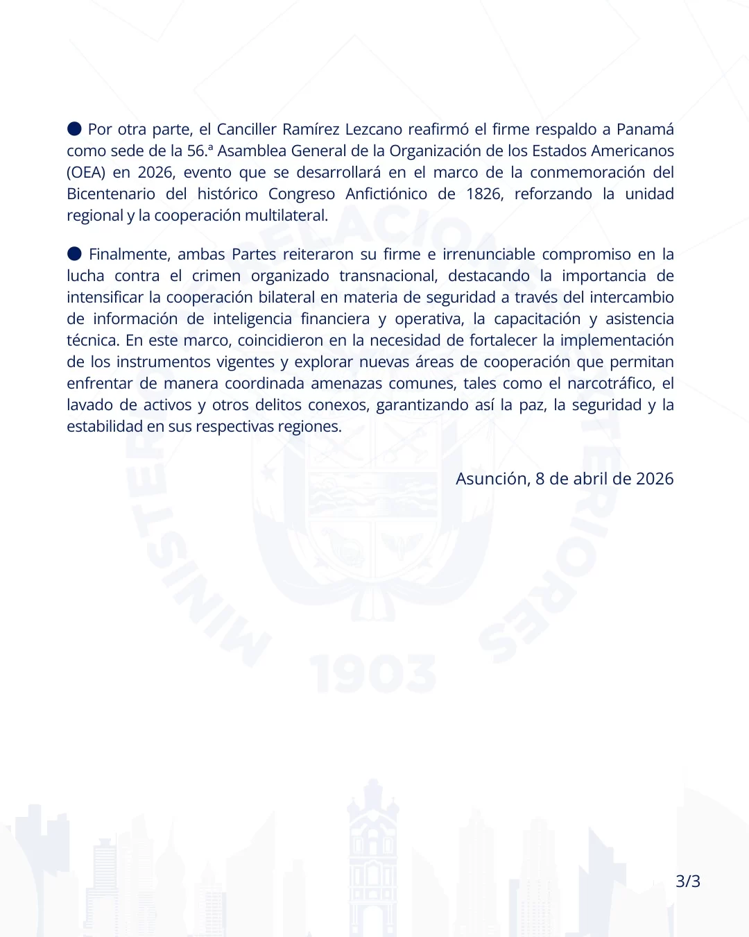 Comunicado Conjunto República de Panamá – República del Paraguay jbagonzalez2026-04-08T10:07:15-05:008 de abril de 2026| Comparte esta noticia en tus redes FacebookXWhatsAppCorreo electrónico Artículos relacionados Paraguay y Panamá refuerzan compromisos de integración, política, económica y logística Galería Paraguay y Panamá refuerzan compromisos de integración, política, económica y logística 8 de abril de 2026 Visita del canciller Martínez-Acha Vásquez a Paraguay potenciará a Panamá como centro logístico, comercial y de conectividad internacional Galería Visita del canciller Martínez-Acha Vásquez a Paraguay potenciará a Panamá como centro logístico, comercial y de conectividad internacional 7 de abril de 2026 Panamá fortalece lazos diplomáticos con Mongolia Galería Panamá fortalece lazos diplomáticos con Mongolia 7 de abril de 2026 Panamá será sede del XXVI Período Ordinario de Sesiones del CICTE Galería Panamá será sede del XXVI Período Ordinario de Sesiones del CICTE 6 de abril de 2026