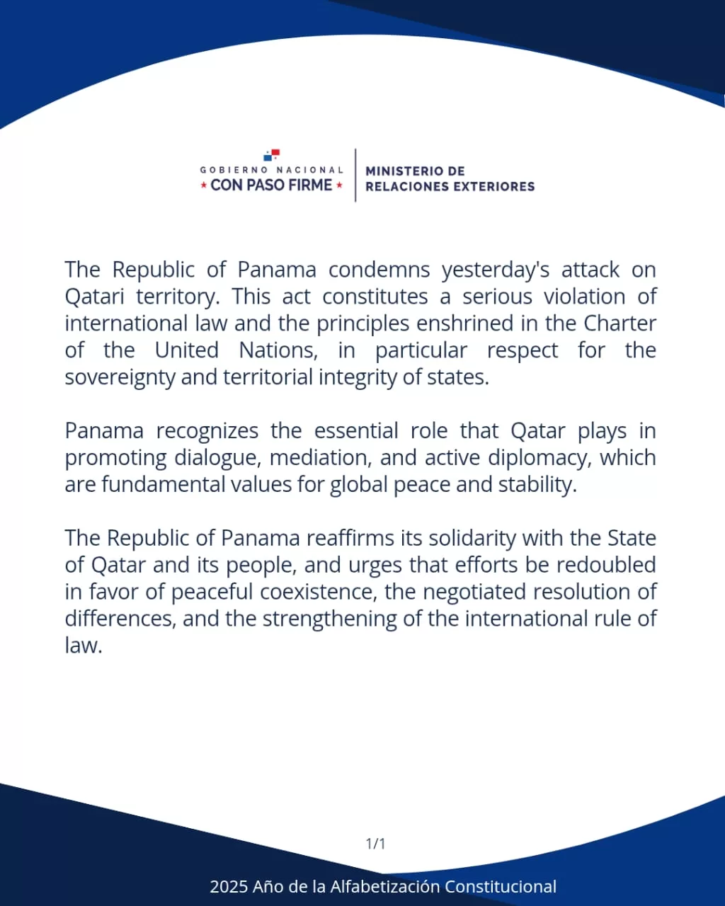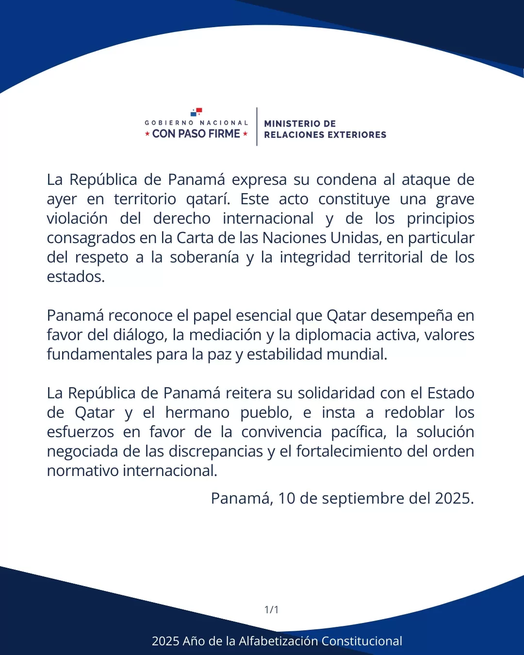 Comunicado oficial jbagonzalez2025-09-10T17:32:35-05:0010 de septiembre de 2025| Comparte esta noticia en tus redes FacebookXWhatsAppCorreo electrónico Artículos relacionados El Gobierno de la República de Panamá expresa sus más sentidas condolencias al pueblo y al Gobierno de Canadá por el trágico suceso ocurrido en la comunidad de Tumbler Ridge, Columbia Británica, que ha enlutado a tantas familias y ha conmocionado profundamente a toda la nación canadiense. Galería El Gobierno de la República de Panamá expresa sus más sentidas condolencias al pueblo y al Gobierno de Canadá por el trágico suceso ocurrido en la comunidad de Tumbler Ridge, Columbia Británica, que ha enlutado a tantas familias y ha conmocionado profundamente a toda la nación canadiense. 11 de febrero de 2026 Panamá recibe invitación oficial para integrarse a la agenda de CELAC 2026 Galería Panamá recibe invitación oficial para integrarse a la agenda de CELAC 2026 11 de febrero de 2026 Proyectan Parque Arqueológico El Caño a nivel global Galería Proyectan Parque Arqueológico El Caño a nivel global 11 de febrero de 2026 Mulino se reúne con miembros del Consejo de Relaciones Exteriores Galería Mulino se reúne con miembros del Consejo de Relaciones Exteriores 11 de febrero de 2026