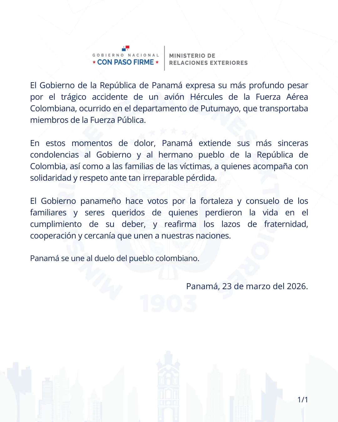 EL GOBIERNO DE LA REPUBLICA DE PANAMÁ EXPRESA SU MÁS PROFUNDO PESAR POR EL TRÁGICO ACCIDENTE DE UN AVIÓN HÉRCULES DE LA FUERZA ARMADA DE COLOMBIA jbagonzalez2026-03-24T00:06:16-05:0023 de marzo de 2026| Comparte esta noticia en tus redes FacebookXWhatsAppCorreo electrónico Artículos relacionados Bicentenario del Congreso Anfictiónico en la prensa de República Dominicana Galería Bicentenario del Congreso Anfictiónico en la prensa de República Dominicana 23 de marzo de 2026 Experto británico analizará el rol del Reino Unido en el Bicentenario del Congreso Anfictiónico de Panamá Galería Experto británico analizará el rol del Reino Unido en el Bicentenario del Congreso Anfictiónico de Panamá 23 de marzo de 2026 Panamá participa en la X Cumbre de la CELAC en Bogotá Galería Panamá participa en la X Cumbre de la CELAC en Bogotá 22 de marzo de 2026 Panamá consolida presencia en el SICA Galería Panamá consolida presencia en el SICA 21 de marzo de 2026