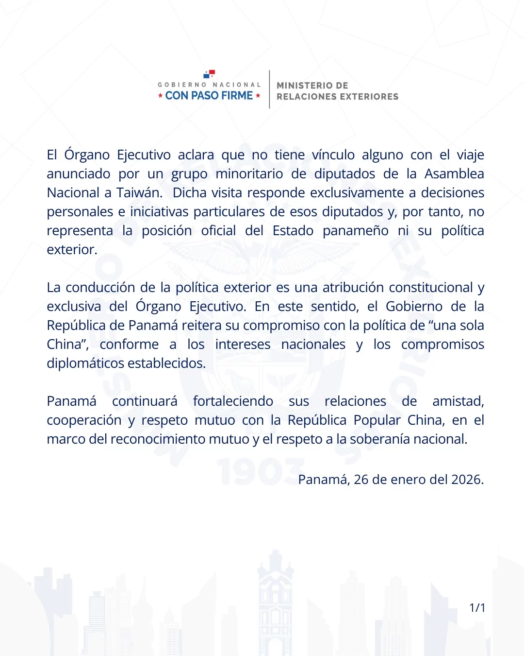El Órgano Ejecutivo aclara que no tiene vínculo alguno con el viaje anunciado por un grupo minoritario de diputados de la Asamblea Nacional a Taiwán