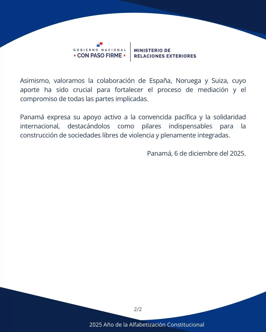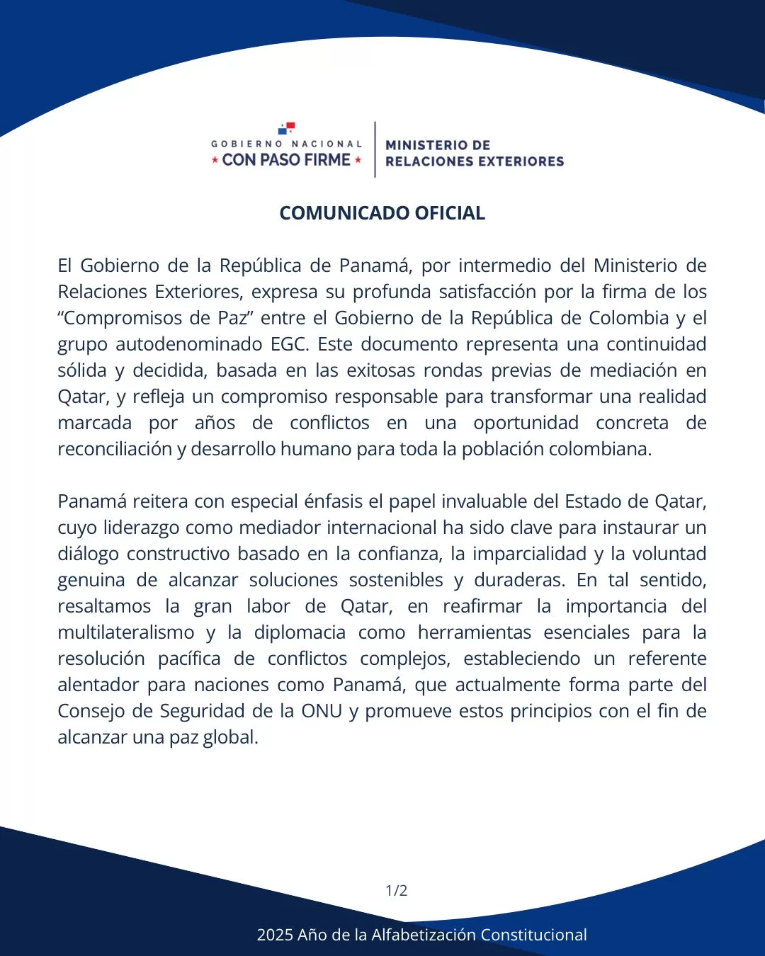 Panamá celebra los compromisos de paz alcanzados por los auspicios de Qatar entre el Gobierno de Colombia y el grupo autodesignado EGC. jbagonzalez2025-12-06T19:00:24-05:006 de diciembre de 2025| Comparte esta noticia en tus redes FacebookXWhatsAppCorreo electrónico Artículos relacionados Panama welcomes the peace commitments reached, thanks to the auspices of Qatar, between the Government of Colombia and the self-appointed EGC group. Galería Panama welcomes the peace commitments reached, thanks to the auspices of Qatar, between the Government of Colombia and the self-appointed EGC group. 6 de diciembre de 2025 Encuentro del vicecanciller Hoyos con el canciller Al-Muraikhi de Qatar fortalece relación estratégica bilateral Galería Encuentro del vicecanciller Hoyos con el canciller Al-Muraikhi de Qatar fortalece relación estratégica bilateral 6 de diciembre de 2025 Panamá destaca la ciencia y la cooperación multilateral como herramienta de desarrollo sostenible y competitividad nacional Galería Panamá destaca la ciencia y la cooperación multilateral como herramienta de desarrollo sostenible y competitividad nacional 6 de diciembre de 2025 Canciller anuncia que Panamá acogerá el Nobel Sustainability Trust Summit en 2028 Galería Canciller anuncia que Panamá acogerá el Nobel Sustainability Trust Summit en 2028 5 de diciembre de 2025