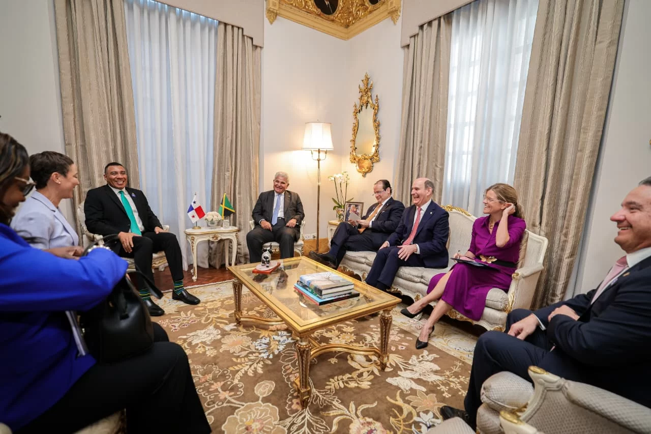 El presidente de la República, José Raúl Mulino, recibió este jueves en su despacho del Palacio de las Garzas al primer ministro de Jamaica, Andrew Holness, quien dijo sentirse impresionado por el empuje que ha tenido el sector construcción en Panamá y por sus icónicas megaobras, como la ampliación del Canal Interoceánico.
