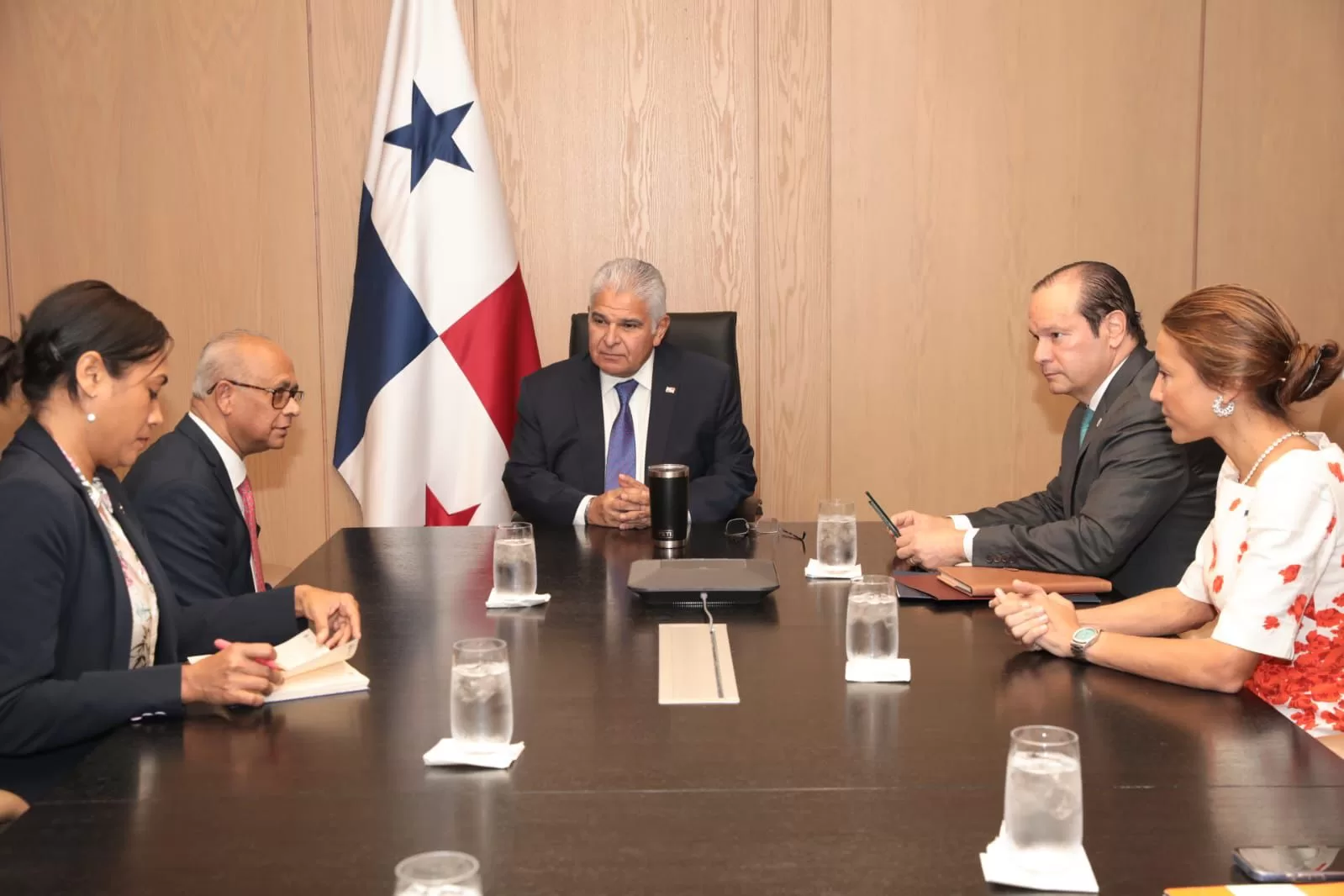 El presidente de la República, José Raúl Mulino, recibió hoy en su despacho al secretario general de la Organización de Estados Americanos (OEA), Albert Ramdin, con quien conversó sobre la situación geopolítica en América y los esfuerzos de este organismo multilateral en defensa de la paz, la prosperidad, la democracia y la no discriminación en la región.